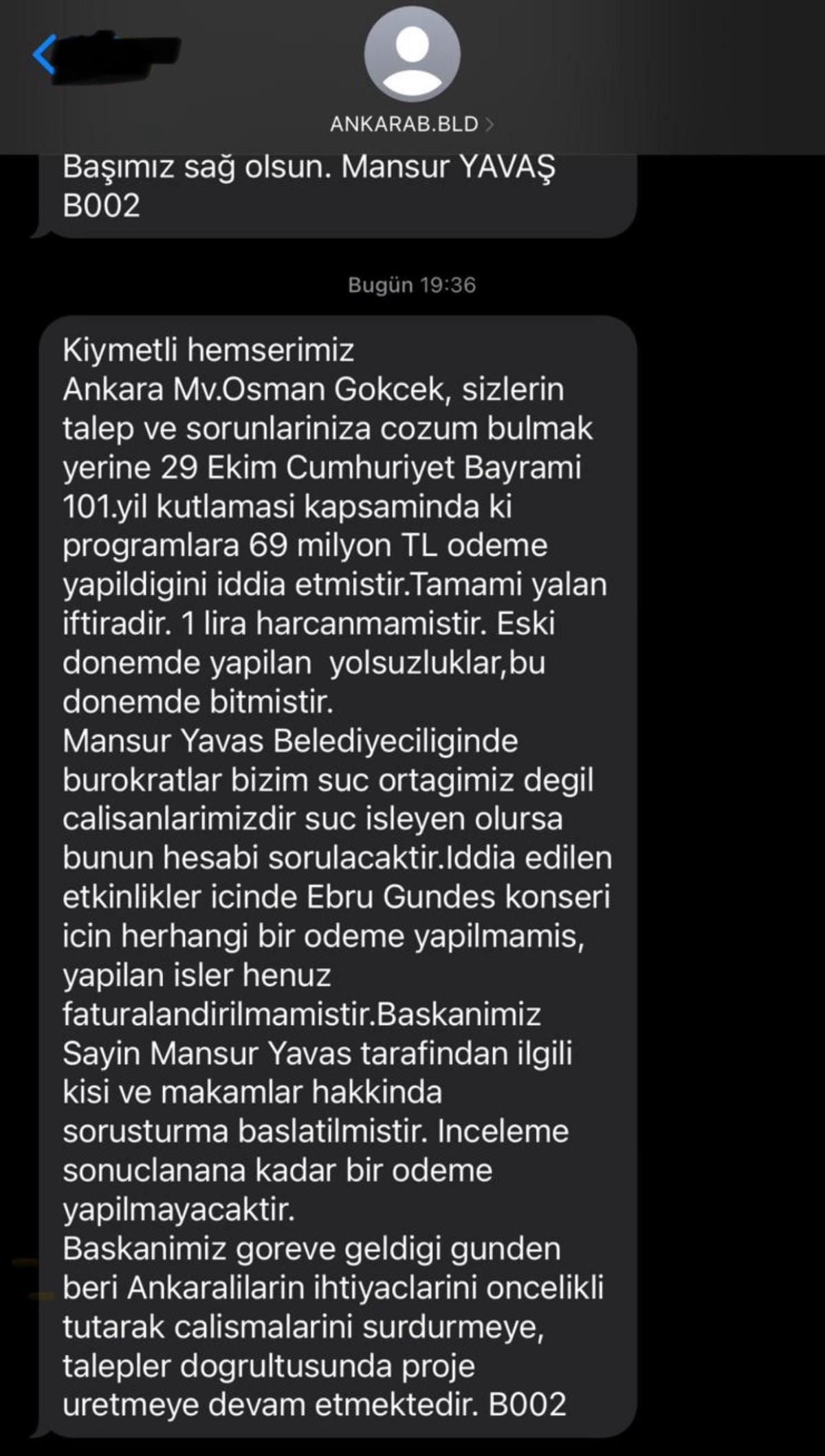 AK Parti Ankara Milletvekili Osman Gökçek, sosyal medya hesabından yayınladığı açıklamada, Mansur Yavaş'ın, kendi iddialarını yalanlayan mesaj attığını paylaştı.
