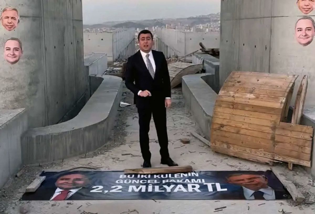 Gökçek, alana özel olarak getirttiği "Bu iki kulenin güncel rakamı 2.2 milyar TL" yazılı pankartın önünde konuştu.