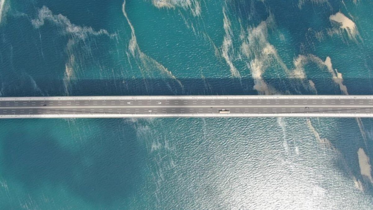 Deniz salyası ile birlikte korkutan manzaranın oluştuğu Osmangazi Köprüsü drone ile görüntülendi.