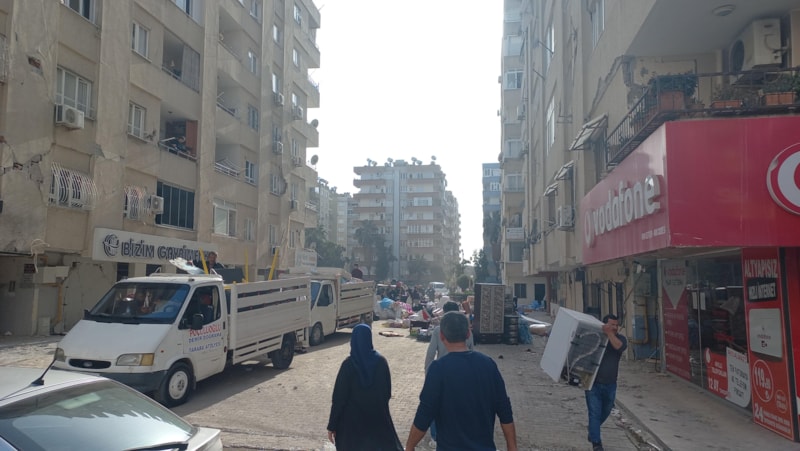 Merkeze bağlı Adnan Menderes Mahallesi'nde bulunan depremde 2 bloku yıkılan Metin Tamer Sitesi ve Sefa Evler Sitesi'nde ağır hasarlı binalara gelen vatandaşlar, dairedeki eşyaları aşağıya indirmek için birbiriyle yarıştı.