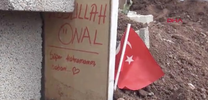 Hayatını kaybeden Abdullah Önal'ın mezarının başına yerleştirilen ahşaba, çocuğunun 'Süper kahramanım, babam' yazması dikkat çekti.