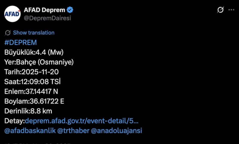 AFAD'ın son paylaştığı verilere göre Osmaniye'de 4.4 büyüklüğünde bir deprem meydana geldi. Saat 12.09'da kaydedilen sarsıntının yerin 8.8 km derinliğinde gerçekleştiği bildirildi.