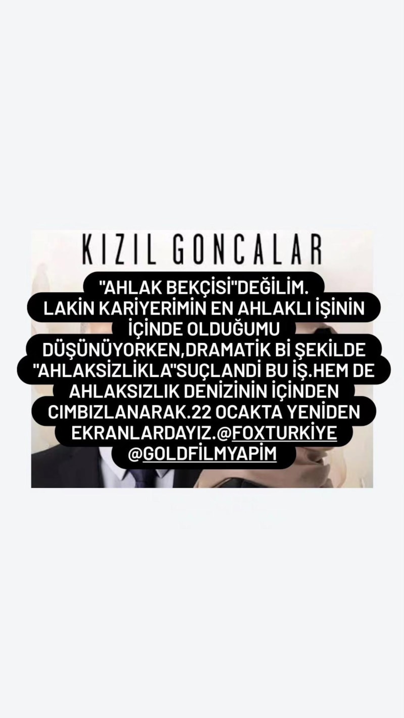"Ahlak bekçisi değilim. Lakin kariyerimin en ahlaklı işinin içinde olduğumu düşünüyorken, dramatik bir şekilde ahlaksızlıkla suçlanan bu iş... Hem de ahlaksızlık denizinin içinden cımbızlanarak... 22 Ocak'ta yeniden ekranlardayız."