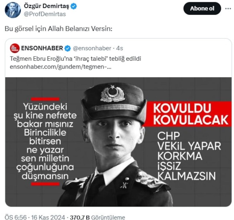 X hesabından Ensonhaber’in haberini paylaşan Özgür Demirtaş, “Bu görsel için Allah belanızı versin” yazdı.