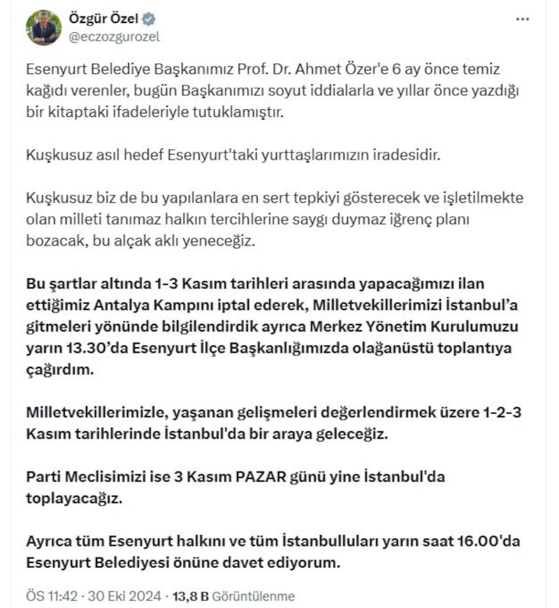 Özel, "Esenyurt Belediye Başkanımız Prof. Dr. Ahmet Özer'e 6 ay önce temiz kağıdı verenler, bugün Başkanımızı soyut iddialarla ve yıllar önce yazdığı bir kitaptaki ifadeleriyle tutuklamıştır. Kuşkusuz asıl hedef Esenyurt'taki yurttaşlarımızın iradesidir. Kuşkusuz biz de bu yapılanlara en sert tepkiyi gösterecek ve işletilmekte olan milleti tanımaz halkın tercihlerine saygı duymaz iğrenç planı bozacak, bu alçak aklı yeneceğiz. Esenyurt halkını ve tüm İstanbulluları yarın saat 16.00'da Esenyurt Belediyesi önüne davet ediyorum." açıklamasını yaptı.