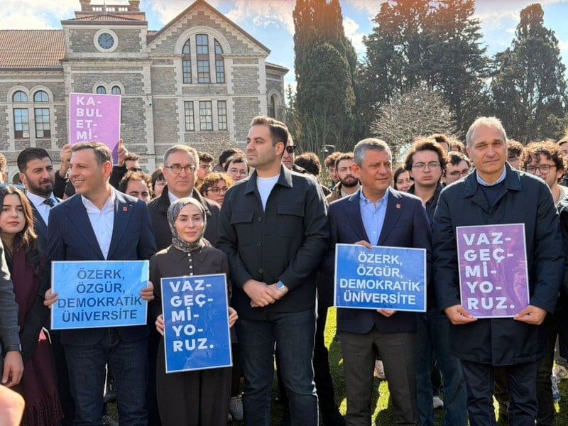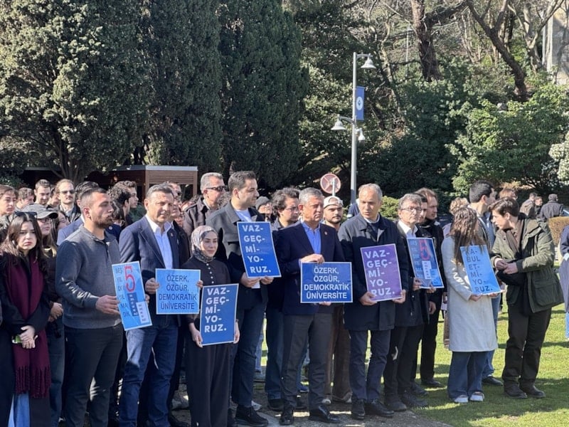 Özgür Özel, Boğaziçi Üniversitesi akademisyenleri ile birlikte rektörlük binasına sırtını döndü ve “Özerk, özgür, demokratik üniversite” pankartı taşıdı.