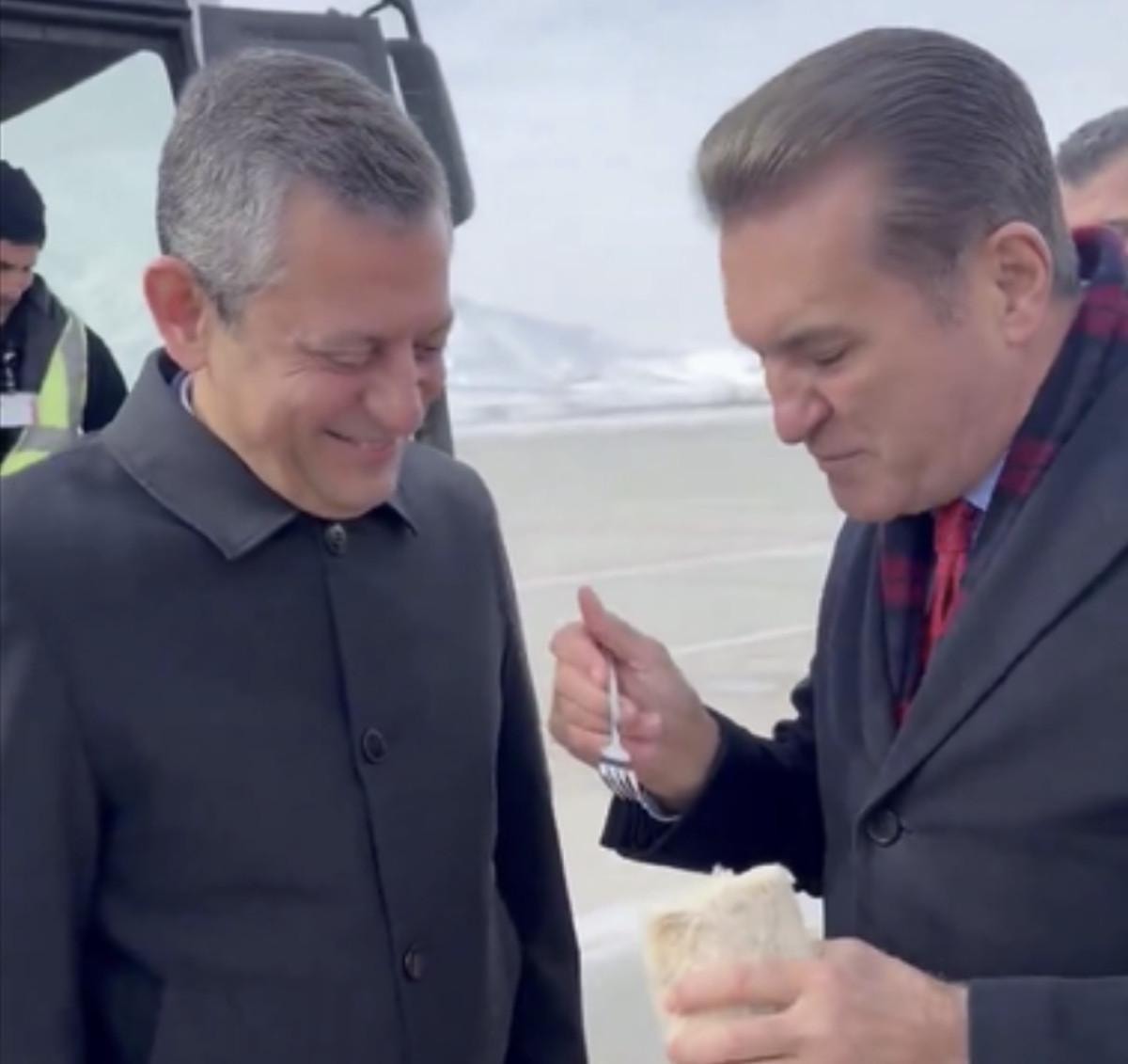 Havalimanında CHP Erzincan Milletvekili Mustafa Sarıgül, Özgür Özel'i karşılarken tulum peyniri ikram etti.