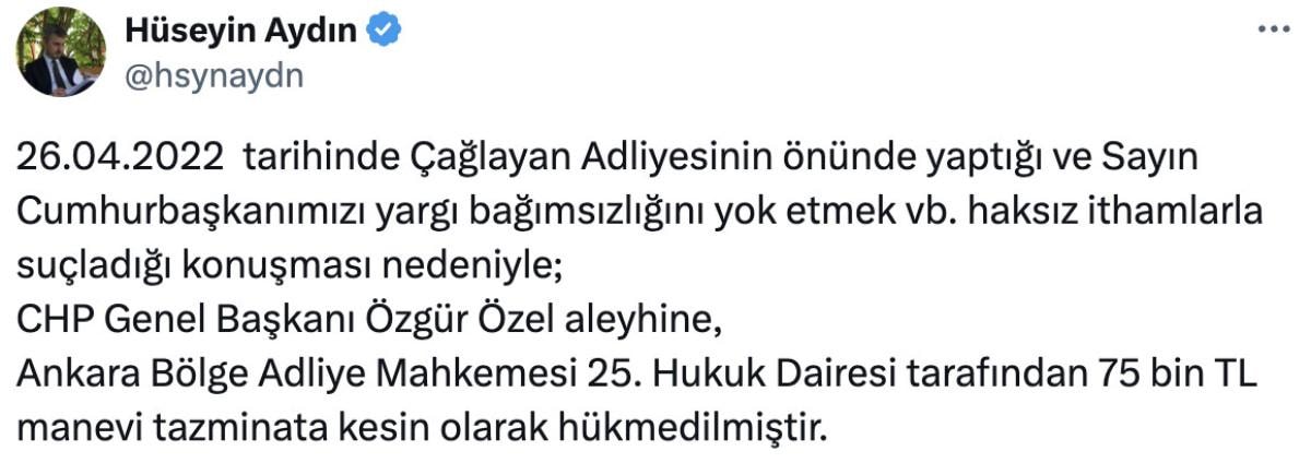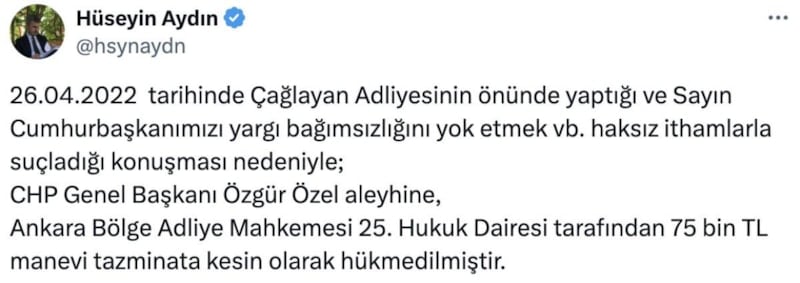 26.04.2022 tarihinde Çağlayan Adliyesinin önünde yaptığı ve Sayın Cumhurbaşkanımızı yargı bağımsızlığını yok etmek vb. haksız ithamlarla suçladığı konuşması nedeniyle; CHP Genel Başkanı Özgür Özel aleyhine, Ankara Bölge Adliye Mahkemesi 25. Hukuk Dairesi tarafından 75 bin TL manevi tazminata kesin olarak hükmedilmiştir.