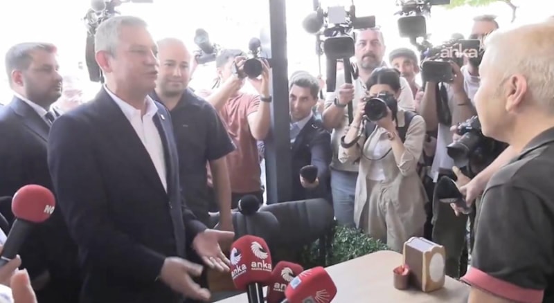 "Benim eşim eczacı, primleri yüksekten ödedik, 14 bin lira emekli maaşı alıyor" diyen Özgür Özel, "Buna da şükür" sözleriyle karşılık veren esnafa kızdı.