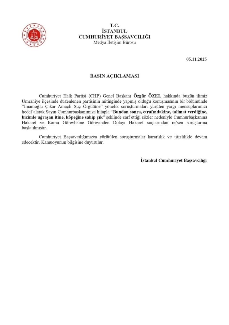 Cumhuriyet Halk Partisi (CHP) Genel Başkanı Özgür ÖZEL hakkında bugün ilimiz Ümraniye ilçesinde düzenlenen partisinin mitinginde yapmış olduğu konuşmasının bir bölümünde "İmamoğlu Çıkar Amaçlı Suç Örgütüne" yönelik soruşturmaları yürüten yargı mensuplarımızı hedef alarak Sayın Cumhurbaşkanımıza hitapla “Bundan sonra, etrafındakine, talimat verdiğine, bizimle uğraşan itine, köpeğine sahip çık” şeklinde sarf ettiği sözler nedeniyle Cumhurbaşkanına Hakaret ve Kamu Görevlisine Görevinden Dolayı Hakaret suçlarından re'sen soruşturma başlatılmıştır.