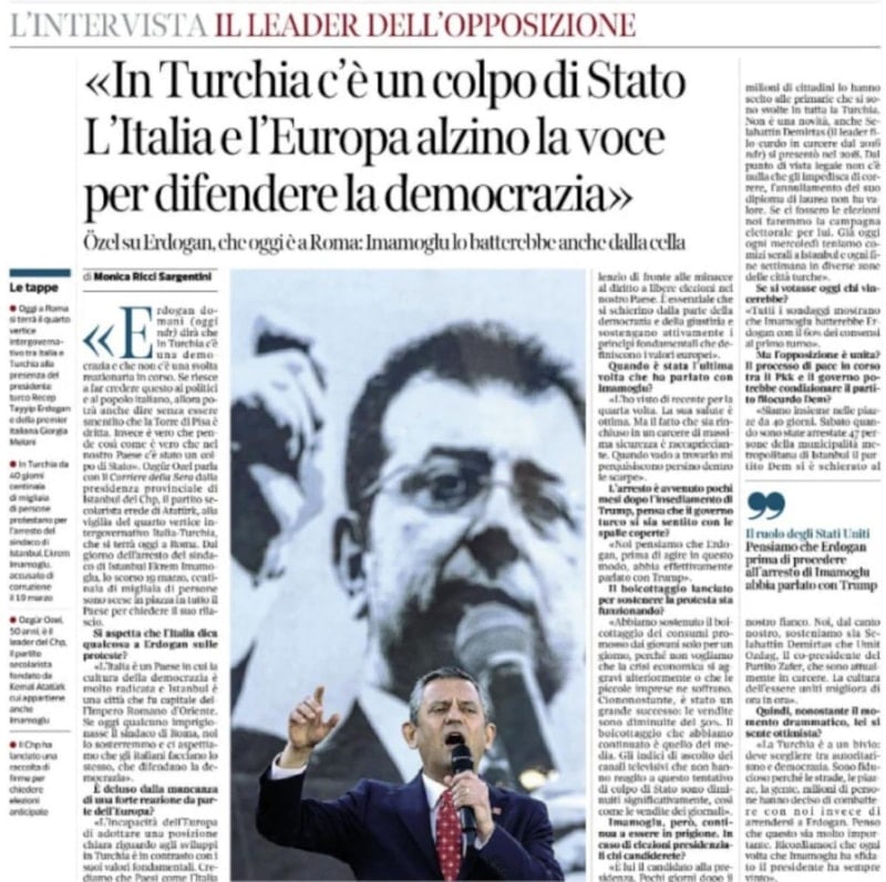 Özgür Özel, Cumhurbaşkanı Recep Tayyip Erdoğan’ın da katılacağı Roma’daki Türkiye-İtalya hükümetlerarası zirvesi öncesinde, İtalyan gazetesi Corriere della Sera'ya verdiği röportajda, Türkiye’deki demokrasi tartışmalarına dikkat çekti.