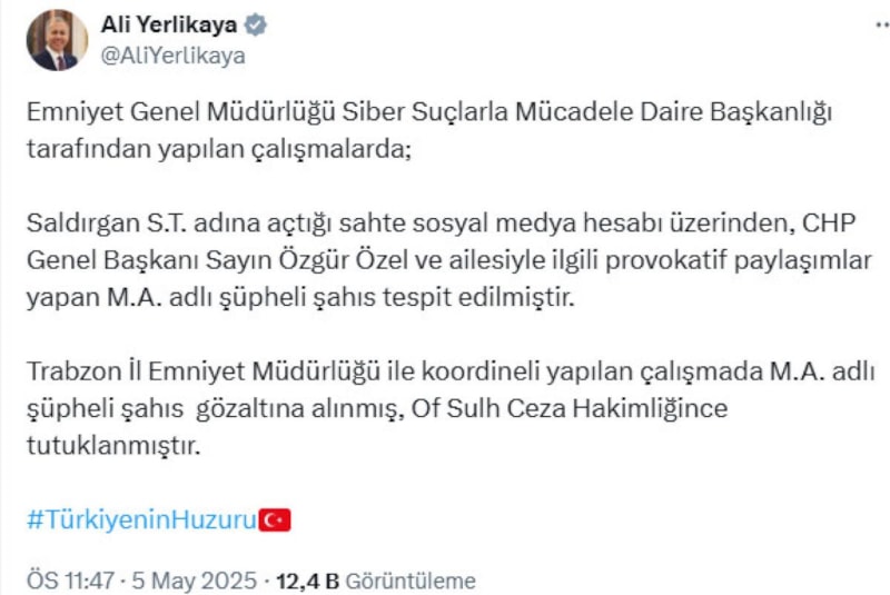 İçişleri Bakanı Ali Yerlikaya, CHP Genel Başkanı Özgür Özel ve ailesiyle ilgili sosyal medyadan provokatif paylaşım yapan şüpheli M.A.'nın tutuklandığını duyurdu..