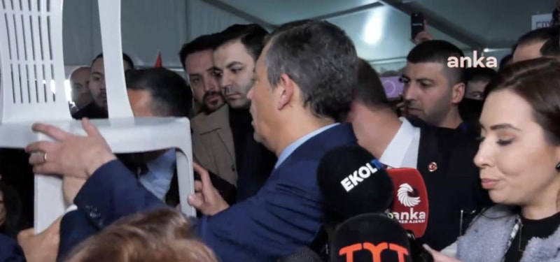 Getirilen bir tabure üzerine çıkan Özel, kalabalığı susturmaya çalıştı.