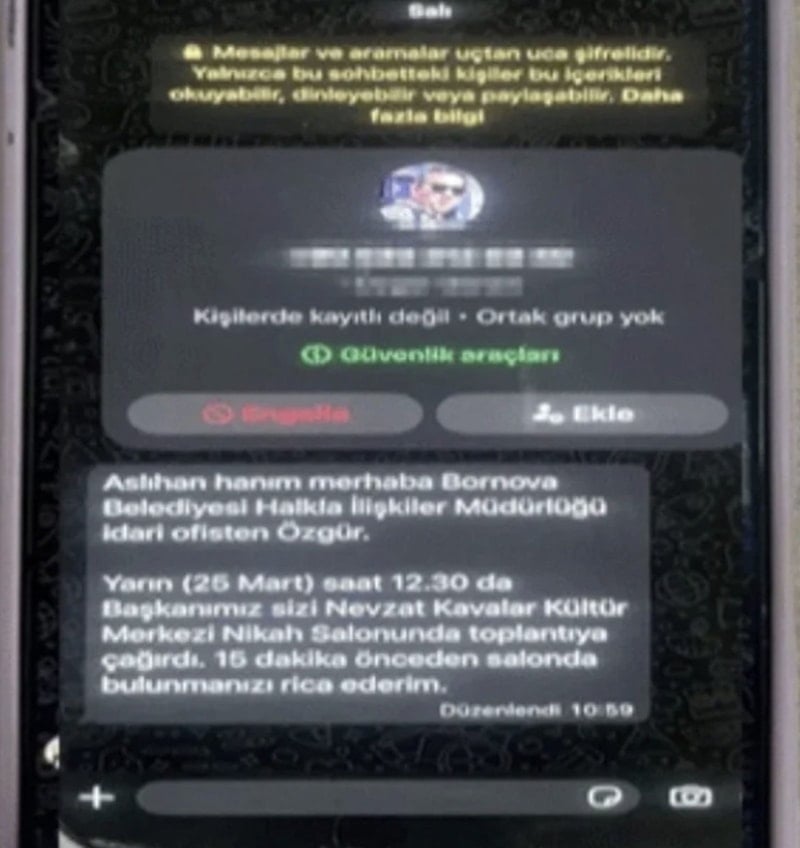 Yazışmalarda, Aslıhan A.'nın işe gitme zorunluluğunu kaldırmak için Bornova Belediye Başkanı ile görüşme talebini, sevgilisi Yalım'dan istediği görülüyor.