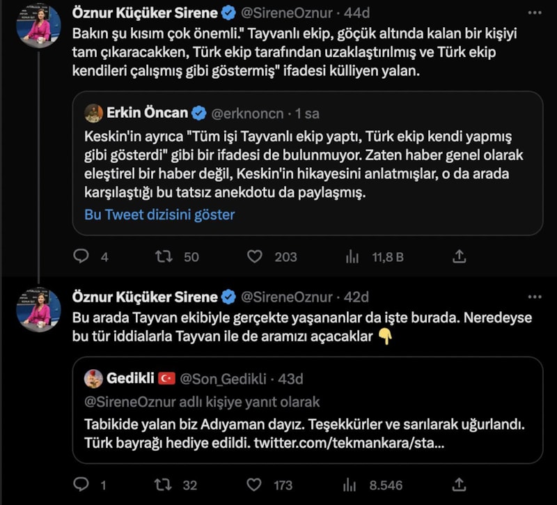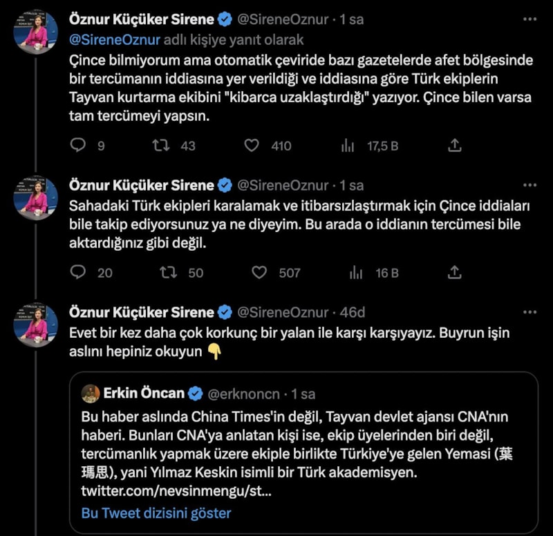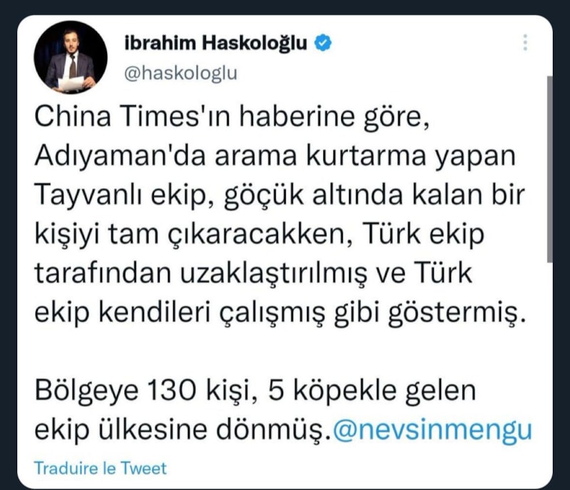 "Şimdi de şunu hızlıca yayıyorlar. Ben şahsen China Times'ın böyle bir haberini aradım ama bulamadım. Yardımcı olur musunuz? Çince bilmiyorum ama otomatik çeviride bazı gazetelerde afet bölgesinde bir tercümanın iddiasına yer verildiği ve iddiasına göre Türk ekiplerin Tayvan kurtarma ekibini "kibarca uzaklaştırdığı" yazıyor. Çince bilen varsa tam tercümeyi yapsın. Sahadaki Türk ekipleri karalamak ve itibarsızlaştırmak için Çince iddiaları bile takip ediyorsunuz ya ne diyeyim. Bu arada o iddianın tercümesi bile aktardığınız gibi değil."
