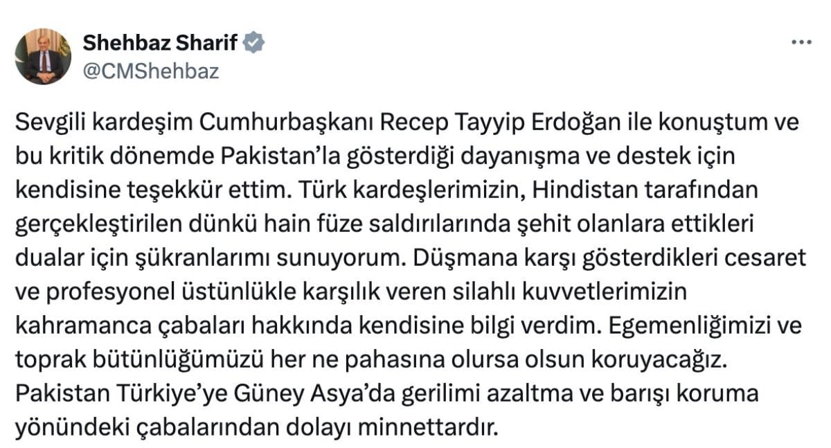 Cumhurbaşkanlığı İletişim Başkanlığı'ndan dün yapılan açıklamaya göre, Şerif ve Cumhurbaşkanı Erdoğan'ın telefon görüşmesinde, Hindistan ve Pakistan arasındaki gerilim, 6 Mayıs gecesi gerçekleşen saldırı ve güncel gelişmeler ele alınmıştı.
