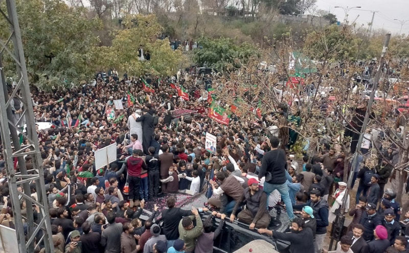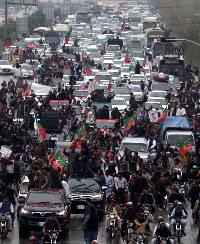 Geçtiğimiz sene kasım ayında bir mitingde bacağından vurulmasından bu yana başkent İslamabad'a ilk kez gelen 70 yaşındaki Khan, sıkı güvenlik önlemleri altında binlerce destekçisi tarafından karşılandı.