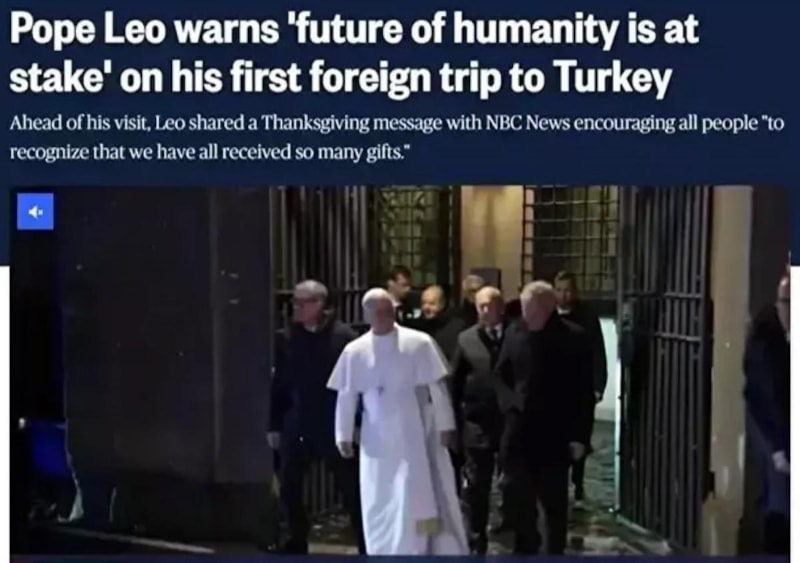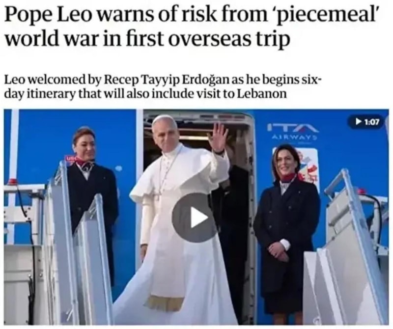 Papa 14. Leo, Türkiye ziyaretinde dünyanın 'küresel ölçekte artan bir çatışma düzeyine teslim olmaması gerektiği' uyarısında bulundu. Papa, 'İnsanlığın geleceği tehlikede' diyerek diyalog ve istikrarın teşvik edilmesi gerektiğine dikkat çekip Cumhurbaşkanı Recep Tayyip Erdoğan'ın 'istikrar kaynağı' olarak rol üstlenmesi çağrısında bulundu.