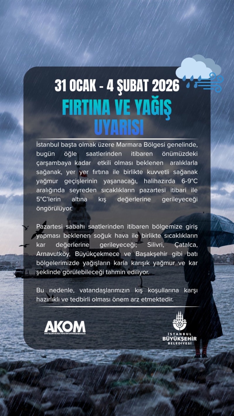 AKOM, İstanbul'da çarşamba gününe kadar beklenen fırtına, kuvvetli sağanak ve karla karışık yağmur için vatandaşları uyardı. Okulların açılacağı pazartesi sabahı için İstanbul'un beş ilçesine kar yağışı uyarısı yapıldı.