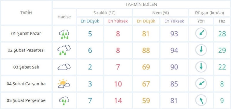Havanın pazartesi günü çok bulutlu, aralıklarla yağmur ve sağanak yağışlı olacağı, yağışların yerel olarak kuvvetli, en düşük sıcaklığın 6, en yüksek sıcaklığın 8 derece olmasının beklendiği aktarılan açıklamada salı günü parçalı ve çok bulutlu, en düşük sıcaklığın 2, en yüksek sıcaklığın ise 7 derece olabileceği belirtildi.