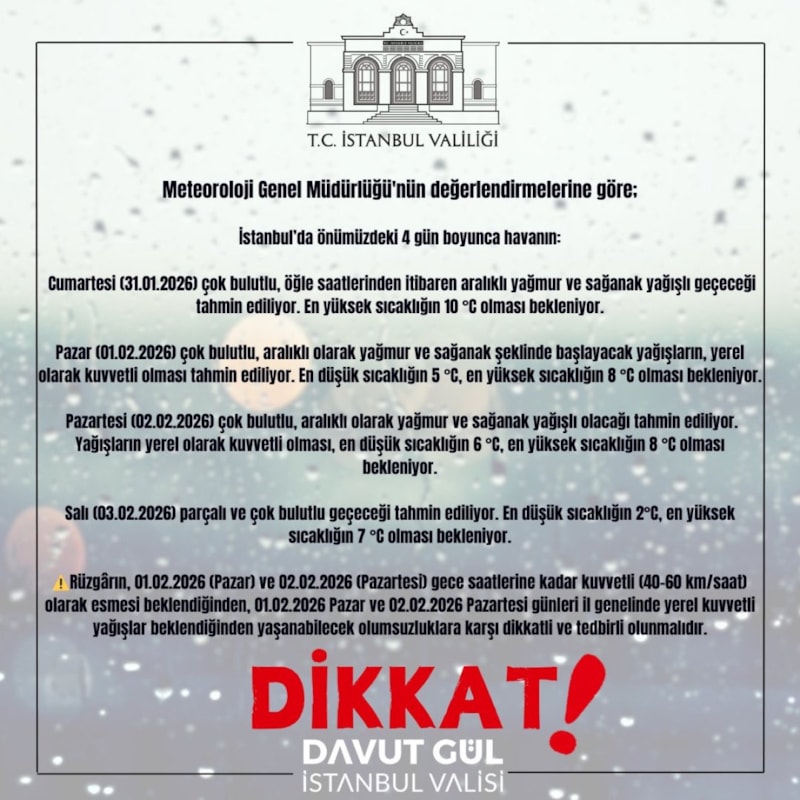 İstanbul Valiliği'nden yapılan açıklamada Meteoroloji Genel Müdürlüğü'nün yaptığı son değerlendirmelere göre pazar gününden itibaren çok bulutlu, aralıklarla yağmur ve sağanak yağışların yerel olarak kuvvetli, en düşük sıcaklığın 5, en yüksek sıcaklığın 8 derece olmasının beklendiği kaydedildi.