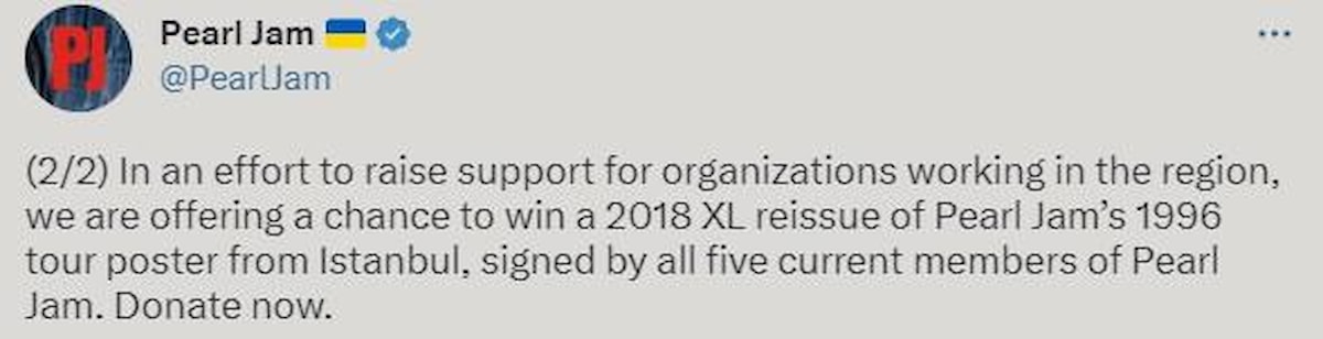 Pearl Jam, Kahramanmaraş merkezli depremlerin ardından afet bölgesine bağış yapan hayranlarından birine, 1996'da İstanbul'da verdikleri konserin yeniden basılmış imzalı afişini hediye edeceğini duyurdu.