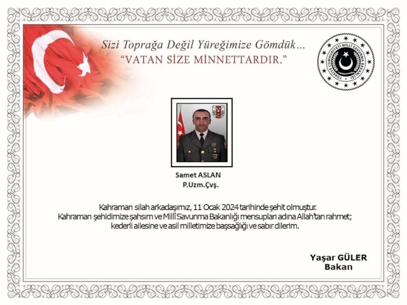 Pençe-Kilit Operasyonu bölgesinde 11 Ocak 2024'te bölücü terör örgütü mensuplarınca düzenlenen taciz ve sızma girişimi neticesinde Piyade Uzman Çavuş Samet Aslan şehit olmuş, bir kahraman silah arkadaşımız da yaralanmıştır. Yaralanan silah arkadaşımız derhal hastaneye sevk edilerek tedavisine başlanmıştır.