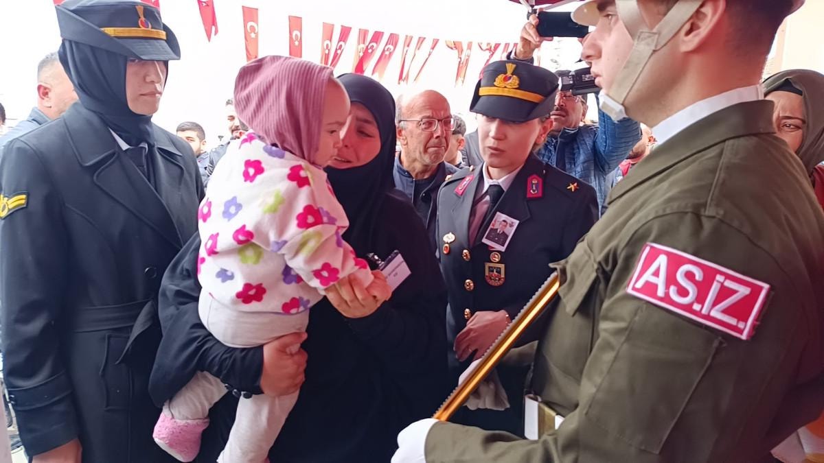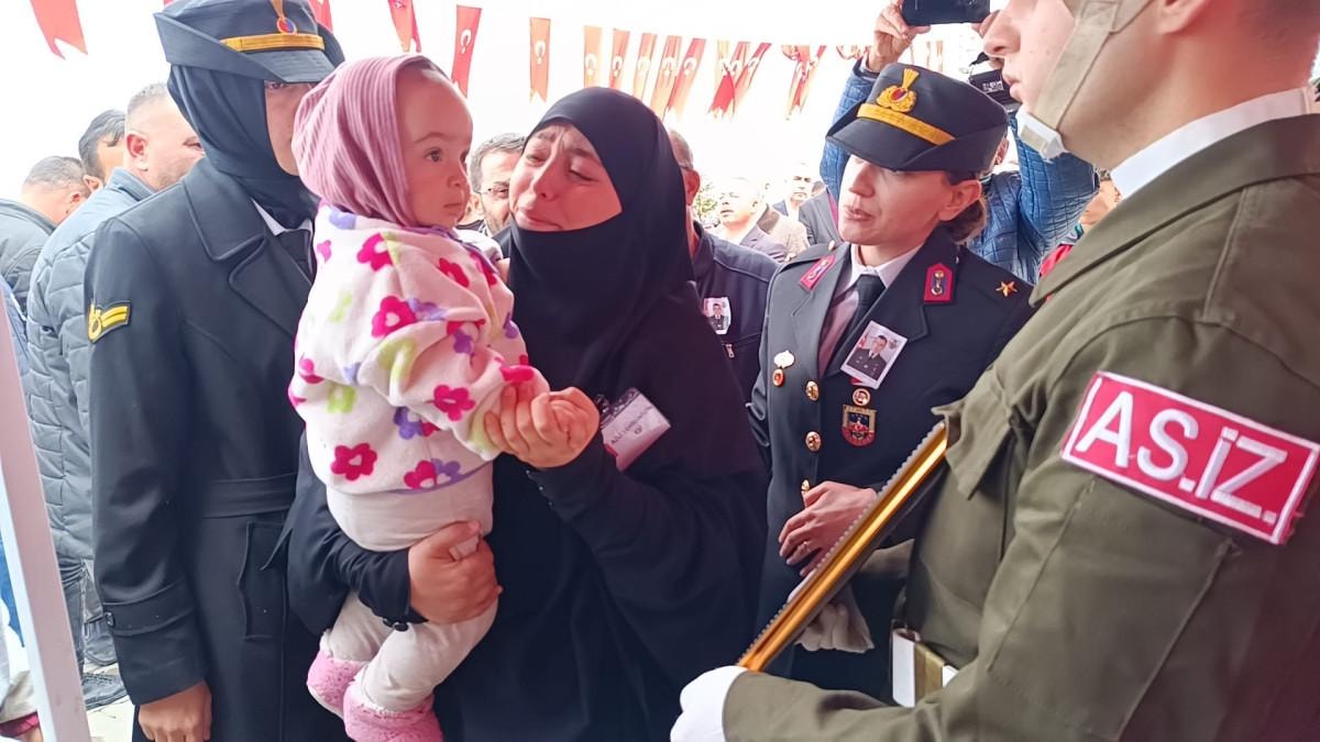Annesi Gülbahar, babası İdris ve eşi Kübra Aslan, şehidin Türk bayrağına sarılı tabutuna sarılıp, çerçevedeki fotoğrafını öptü. Kübra Aslan, kucağındaki bebeği Rüveyda'yı da tabutun başına getirdi.