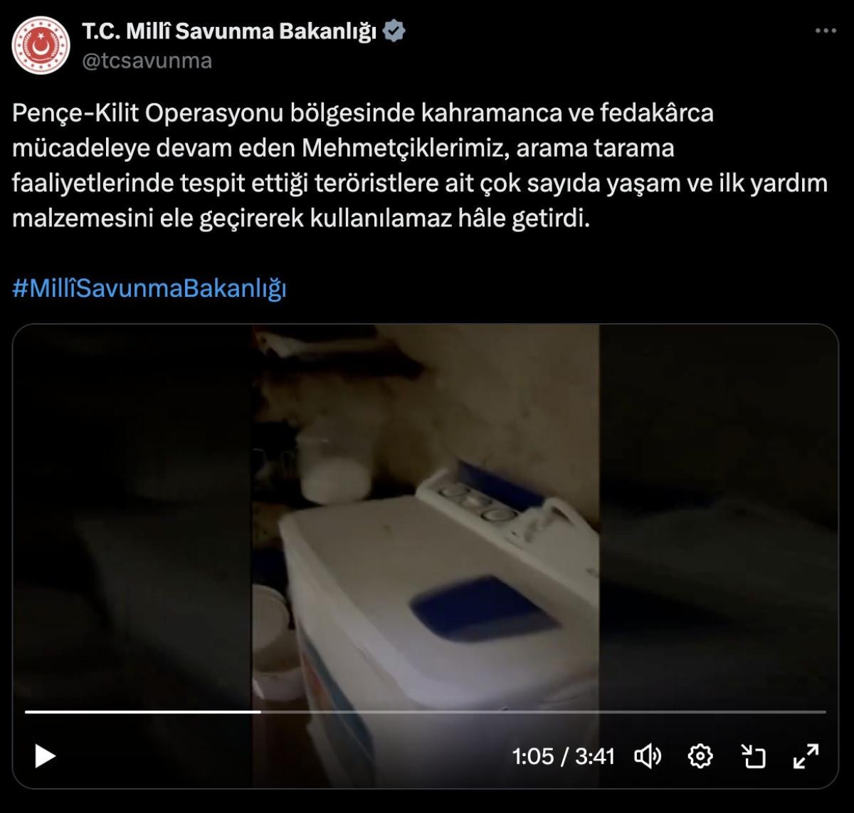 Pençe-Kilit Operasyonu bölgesinde kahramanca ve fedakârca mücadeleye devam eden Mehmetçiklerimiz, arama tarama faaliyetlerinde tespit ettiği teröristlere ait çok sayıda yaşam ve ilk yardım malzemesini ele geçirerek kullanılamaz hâle getirdi.