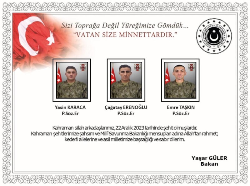 Milli Savunma Bakanlığı (MSB), Irak'ın kuzeyinde 22 Aralık Cuma günü bölücü terör örgütünün saldırısı ve sonrasındaki temasta 3 askerimizin şehit olduğunu, 4 askerimizin yaralandığını açıklamıştı.