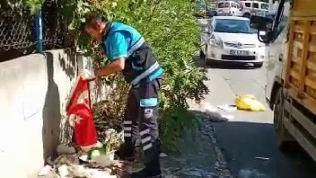 İstanbul'un Pendik ilçesinde görevli bir temizliki işçisi, kaldırımdaki çöplerin arasına atılmıl Türk bayrağını fark etti.