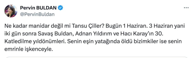 Ne kadar manidar değil mi Tansu Çiller? Bugün 1 Haziran. 3 Haziran yani iki gün sonra Savaş Buldan, Adnan Yıldırım ve Hacı Karay’ın 30. katledilme yıldönümleri. Senin eşin yatağında öldü bizimkiler ise senin emrinle işkenceyle.