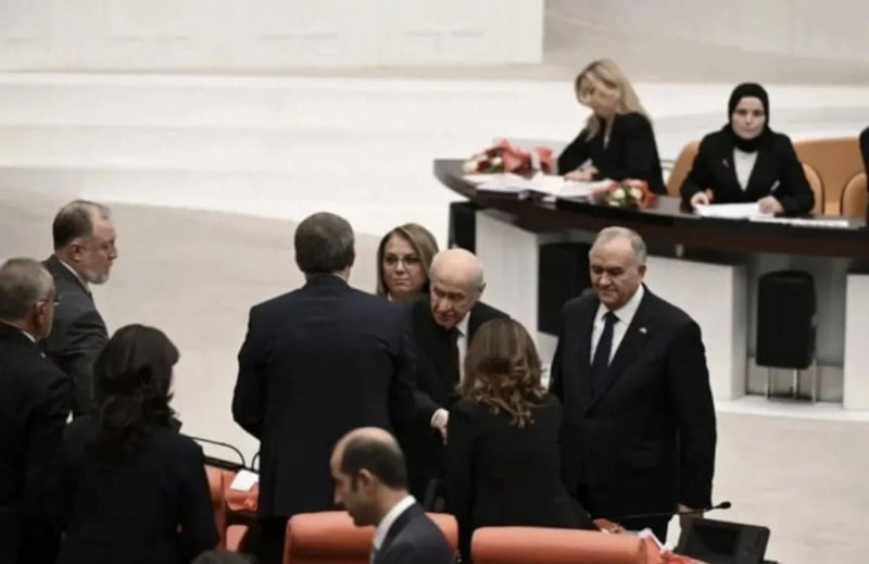 Bahçeli'nin burada DEM Parti Eş Genel Başkanı Tuncer Bakırhan, DEM Parti Grup Başkanvekili Sezai Temelli, DEM Parti Van Milletvekili Pervin Buldan ve DEM Parti Ağrı Milletvekili Sırrı Sakık'ın da aralarında bulunduğu isimlerle tokalaşma anları kameralara yansıdı.