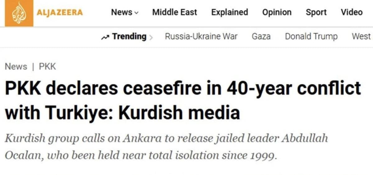 Katar merkezli El Cezire, "PKK, Türkiye ile 40 yıldır süren çatışmalarda ateşkes ilan etti" başlığını kullandı.