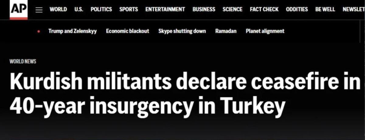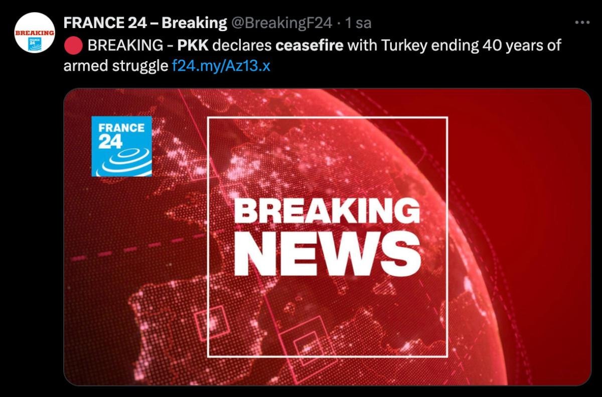 AFP haberinde, “Yasadışı Kürt militanlar hapisteki Abdullah Öcalan'ın örgütü dağılmaya çağıran önemli bir çağrısının ardından Türkiye ile ateşkes ilan etti” diye yazdı.