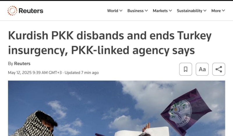 İngiliz basınının köklü gazetelerinden Reuters, PKK'nın fesih kararını 'PKK kendini feshetti, Türkiye’ye yönelik silahlı isyan sona erdi' başlığıyla duyurdu.