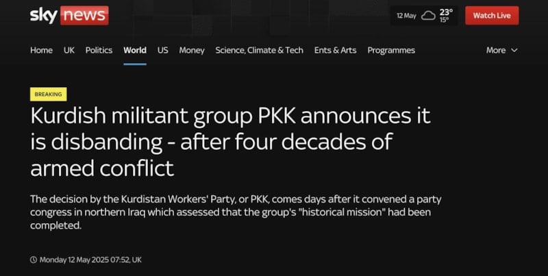 İngiltere merkezli Sky News, terör örgütü PKK’nın kendini fesih kararını, "PKK kendini feshetti, 40 yıllık silahlı çatışma sona erdi" başlığıyla yayınladı.
