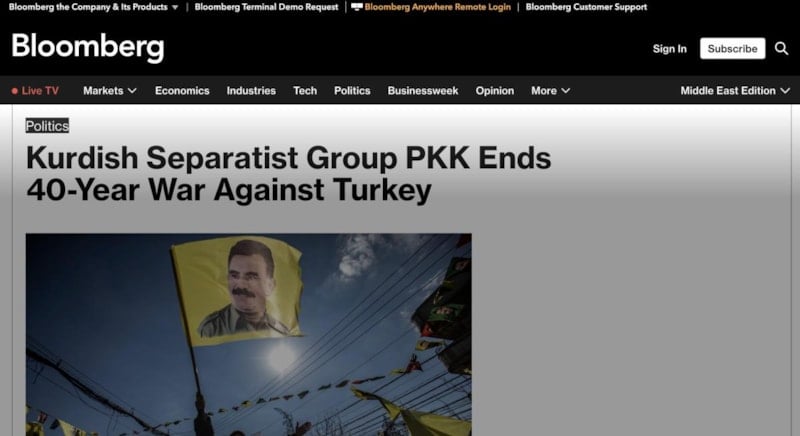 Amerika merkezli Bloomberg haber ajansı, PKK'nın fesih kararını "40 yıllık savaş sona erdi" başlığıyla manşetine taşıdı