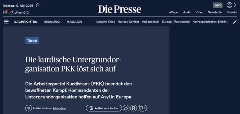 Alman basınından Die Presse gazetesi haberi, PKK'nın fesih kararını "Kürt yeraltı örgütü PKK kendini feshediyor" başlığıyla duyuruldu.