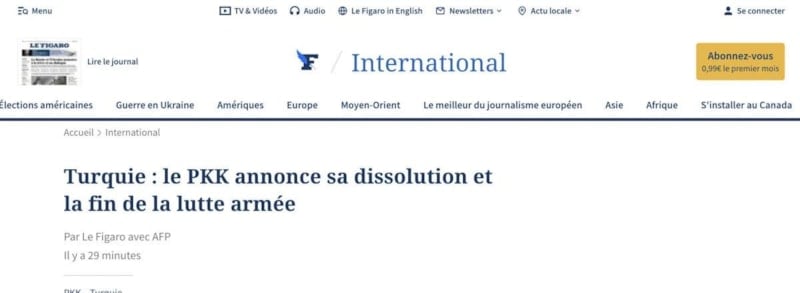 Fransız medyasının en çok takip edilen kanalı Le Figaro, haberi "PKK kendini feshetti ve silahlı mücadeleye son verdi" başlığıyla okuyucularına duyurdu.