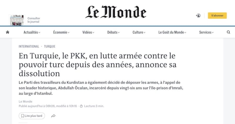 ransız basınından Le Monde gazetesi, PKK’nın fesih kararını "Türkiye’de yıllardır silahlı faaliyet yürüten PKK, kendini feshettiğini açıkladı" başlığıyla duyurdu.