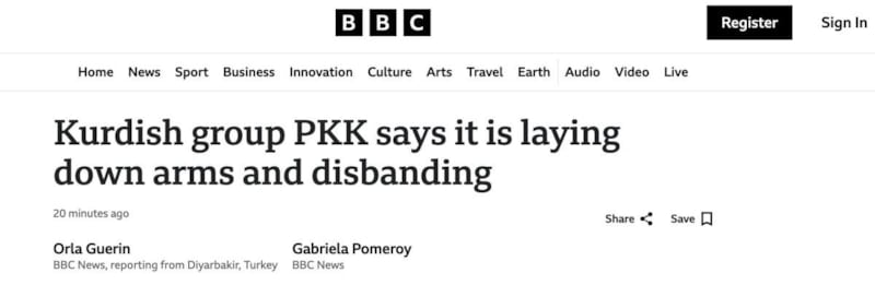 İngiliz kamu yayıncısı BBC, PKK’nın silah bırakma ve fesih kararını “Kürt grubu PKK, silah bıraktığını ve dağıldığını açıkladı" başlığıyla duyurdu.
