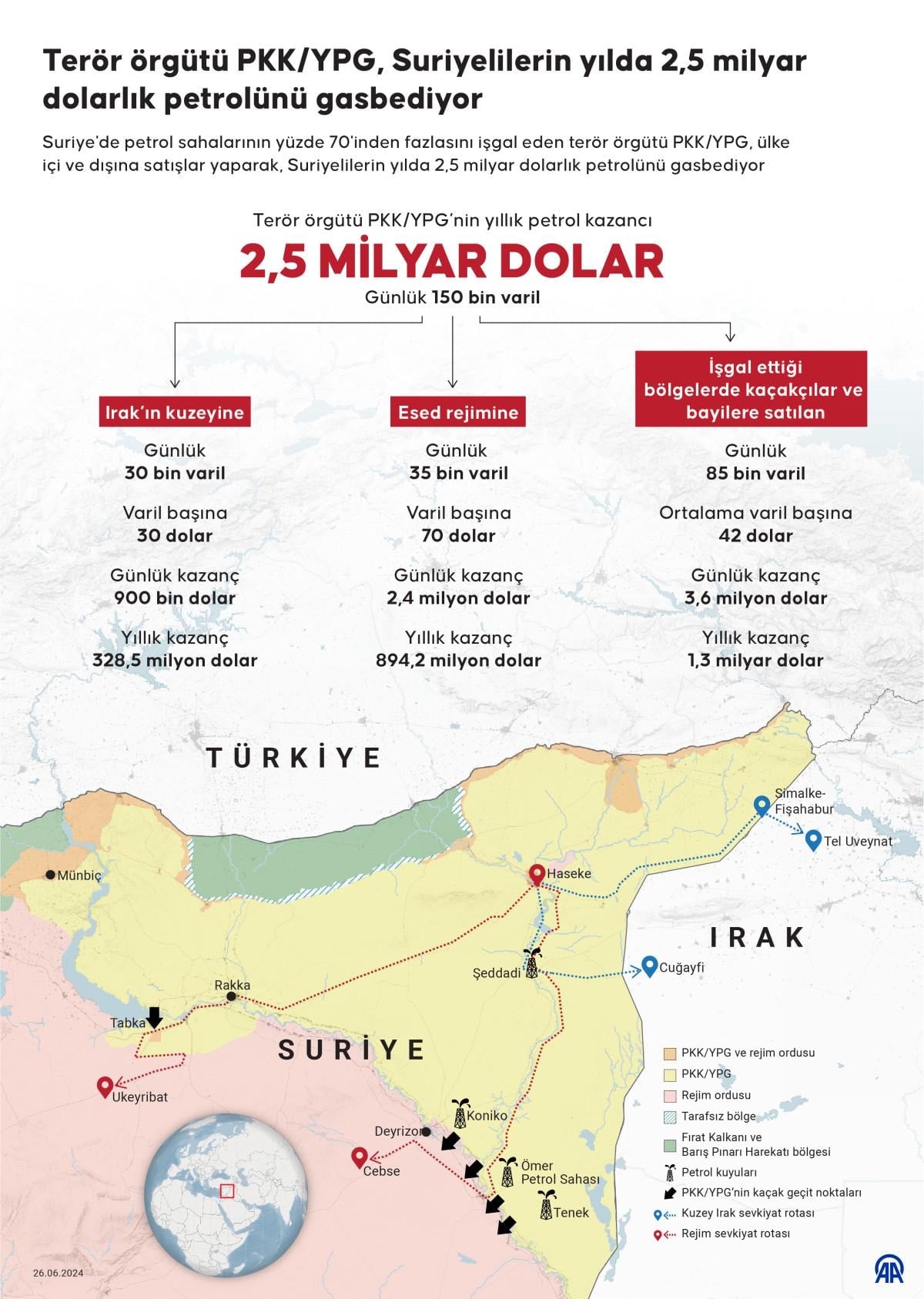 PKK/YPG'nin ABD desteğiyle bölgeyi DEAŞ'tan 2017 sonlarında ele geçirdiği dikkate alındığında 6,5 yıllık dönemde terör örgütünün çok daha büyük bir tutarı kasasına soktuğu ortaya çıkıyor.
