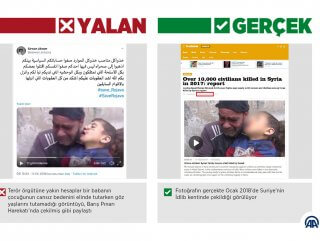Aynı şekilde sosyal medyada harekatı karalamak için çeşitli etiketler kullanan YPG/PKK yandaşları, bir babanın çocuğunun cansız bedenini elinde tutarken göz yaşlarına hakim olamadığı videoyu paylaştı. Aynı görüntünün Ocak 2018'de Suriye'nin İdlib kentinde kaydedildiği anlaşıldı.