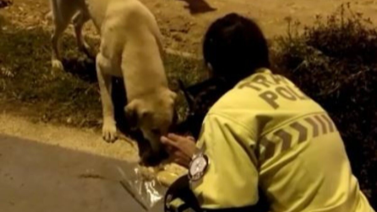 Türkiye’nin tek kadın radarı olarak bilinen polis memuru Fatma Yılmaz, görevi başındayken iftarını yapmak için aracından indiği sırada sokak köpeklerini gördü.