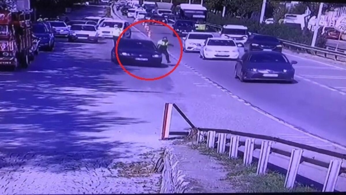 Otomobili durdurmak için aracın kapısına tutunan trafik polisi ise yaklaşık 30 metre araçla birlikte sürüklendikten sonra yere düşerek yaralandı.