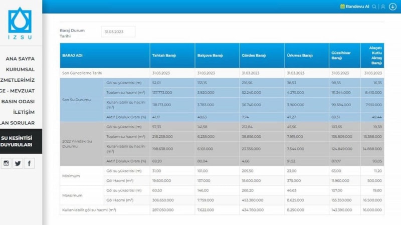 İzmir'in su ihtiyacı Tahtalı, Balçova, Ürkmez, Güzelhisar, Gördes ve Alaçatı Kutlu Aktaş barajlarından ve yer altı kaynaklarından karşılanıyor. Ancak bu yıl havanın soğuk geçmesi nedeniyle yeterli yağış olmadı. Yaşanan kuraklık sebebiyle de barajlardaki su oranlarında düşüş gözlendi.