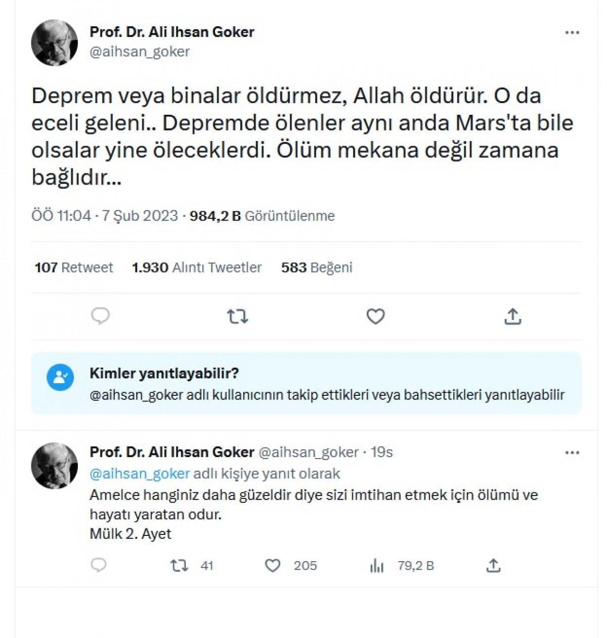 Prof. Dr. Göker, “Deprem veya binalar öldürmez, Allah öldürür. O da eceli geleni. Depremde ölenler aynı anda Mars'ta bile olsalar yine öleceklerdi. Ölüm mekana değil zamana bağlıdır.” dedi.