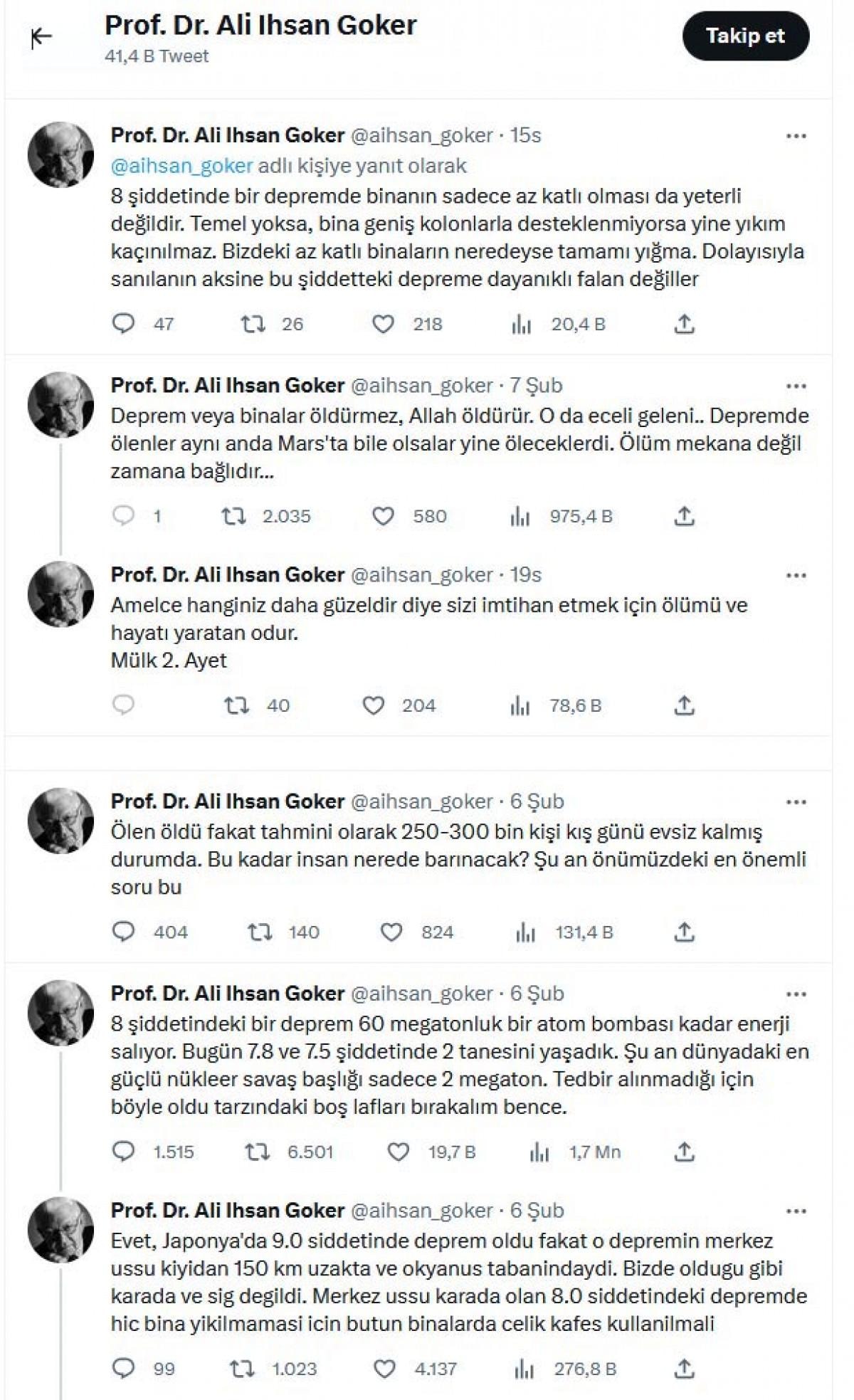 Bilecik Şeyh Edebali Üniversitesi Fen Fakültesi Fizik Bölümü Öğretim Üyesi Prof. Dr. Ali İhsan Göker, Kahramanmaraş merkezli 10 şehirde yıkıma neden olan 2 büyük depremin ardından sosyal medya hesabından paylaşımlarda bulundu.