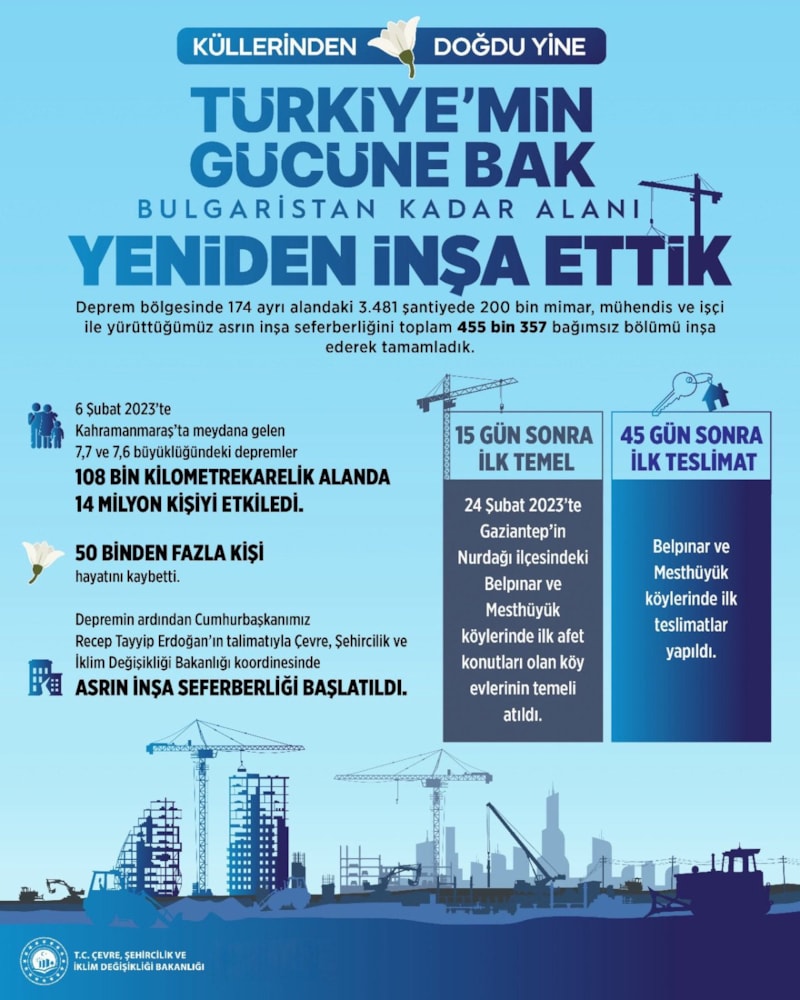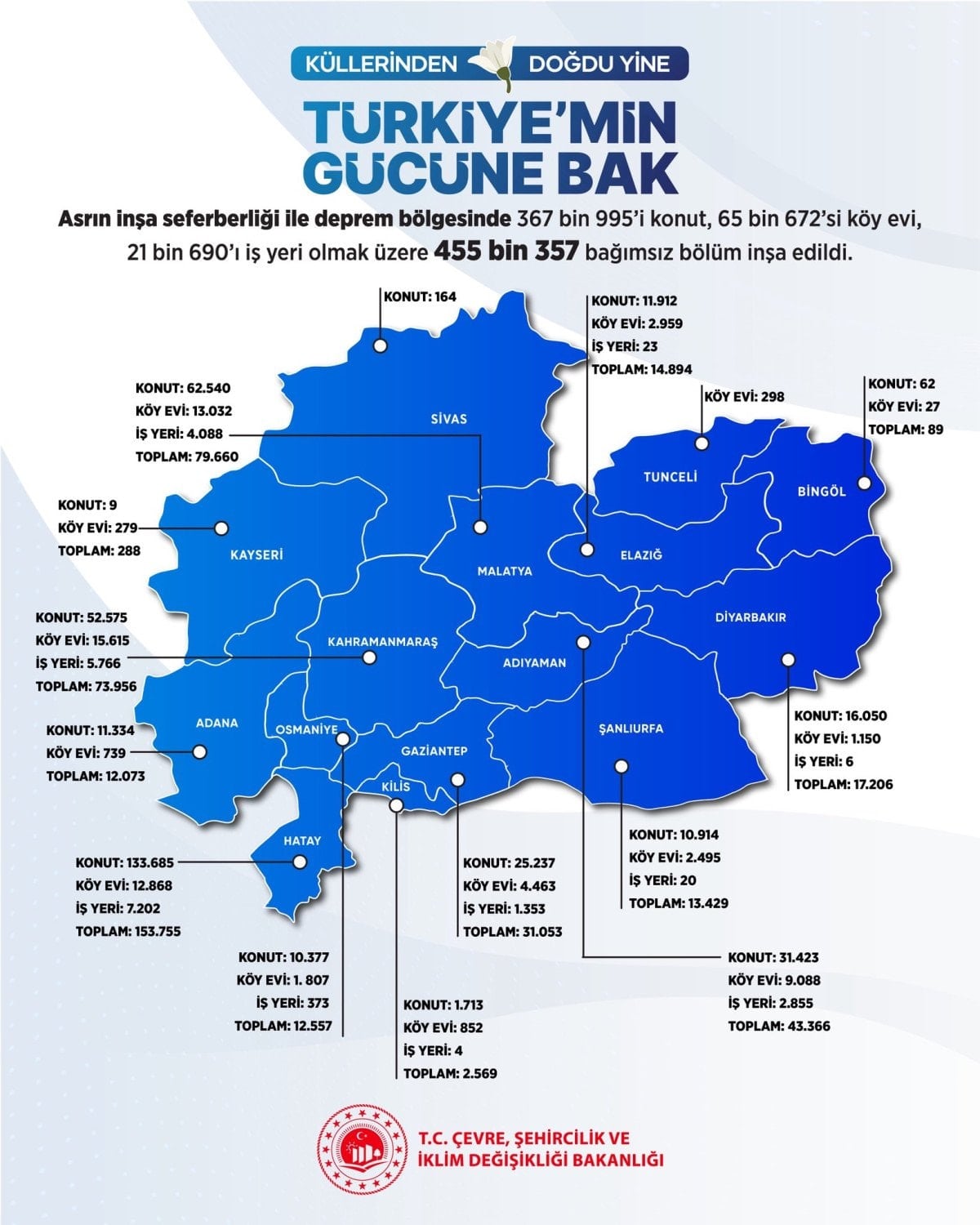 "Türkiye'min Gücüne Bak" sloganıyla paylaşılan görselde; "Asrın inşa seferberliği ile deprem bölgesinde 367 bin 995'i konut, 65 bin 672'si köy evi, 21 bin 690'ı iş yeri olmak üzere 455 bin 357 bağımsız bölüm inşa edildi." notuna yer verildi.